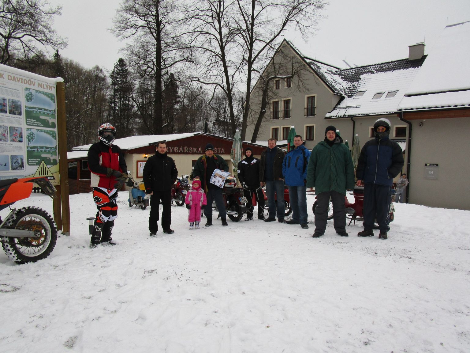 motoNa Silvestra jsme se chtěli jak již tradičně rozloučit s uplynulým rokem vyjížďkou na našich ocelových ořích. Setkání proběhlo ve 13:00 před Hasičarénou. Cíl cesty jsme měli dohodnout těsně před výjezdem. Letošní počasí bylo o dost krutější než v minulých letech. Teploměr ukazoval  -6 stupňů, silnice byly pokryty uježděným sněhem a do toho foukal docela silný vítr. Z těchto důvodů jsem nepředpokládal překonání rekordů z loňského roku a to jak v počtu účastníků (10 strojů a jezdců) tak i ujetých kilometrů (76 Km s cílem na Vaňkově kopci). Jak jsem dojížděl k Hasičaréně tak se před vraty choulili již 3 odvážlivci. Po chvíli se přiřítili další otužilci a to za vydatného řevu svých ocelových koní. Po krátké debatě a návrhu, že vzhledem k povětrnostním podmínkám pojedeme pouze na hradecký zámek bylo rozhodnuto, že se jen tak nezalekneme a vyrazíme mnohem dál – do Kružberku na Davidův mlýn.