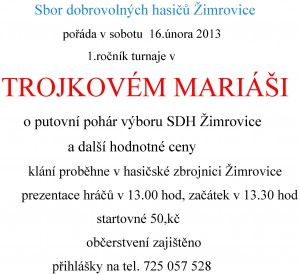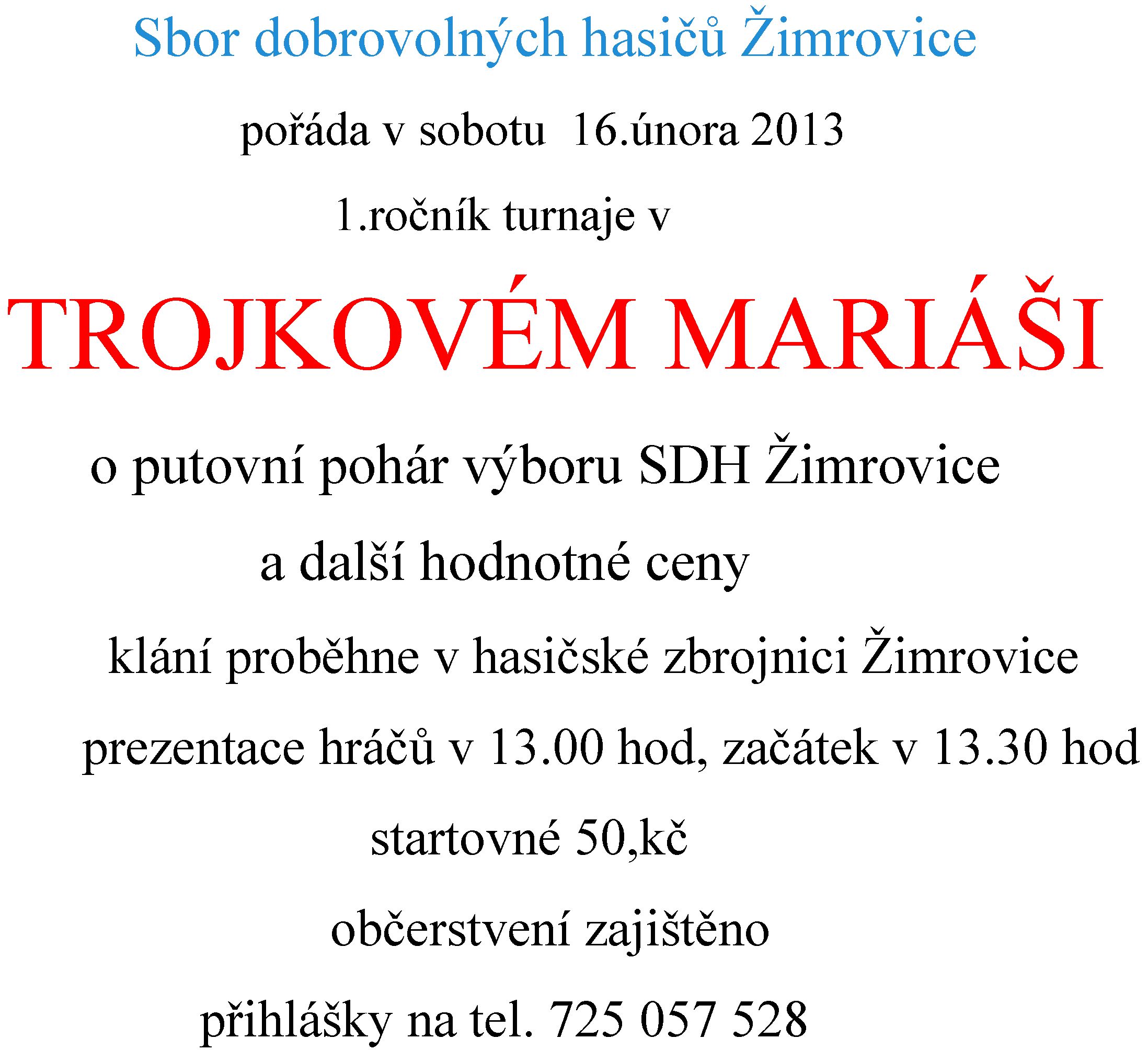 Pro všechny karbaníky: tradiční turnaj v mariáši nekončí, ale pod svá křídla si jej vzali hasiči ze Žimrovic. Tímto Vás zvou na pokračování této akce.