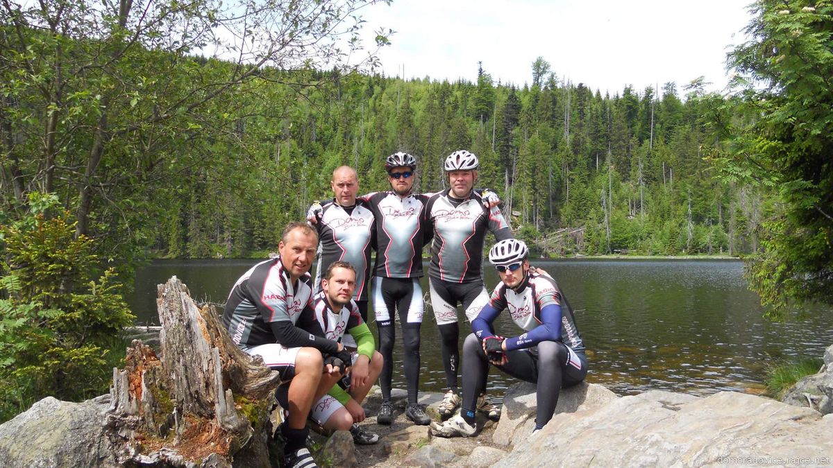 Celá velmi náročná Tour začala brzkým vstáváním, jelikož odjezd z Domo byl naplánován už v 4:40! Nesmělo ovšem chybět již tradiční „rozjetí“ u Marka, který nás uctil alespoň drobným pohoštěním, když už z „rodinných“ důvodu nemohl jet s námi. Snad už konečně i on někdy osedlá to své nové kolečko. Po příjezdu do Opavy jsme si nakoupili nějakou tu občerstvovačku do vlaku a mohlo se vyjet na velmi dlouho cestu do Prahy, kde jsme měli první přestup. V Praze jsme přece nemohli čekat na spoj na nádraží a tak jsme si udělali cyklistický výlet po Václavském náměstí, dali foto u sv. Václava a výborné pivo U Pinkasů. I přes prvotní obavy o stav naší osádky po dlouhé cestě vlakem musíme konstatovat, že pražský výlet se obešel bez jakéhokoliv hanobení dresu. To už nás ale čekala další štreka vlakem do Plzně, Klatov a konečná stanice v Hamrech – Hojsově stráži. Zde jsme vystoupili na nádherném podhorském nádražíčku a čekaly nás první náročné kopcovité kilometry. Tady se k nám přidal i Konva, který měl ještě ten den pracovní povinnosti v Praze. Naštěstí trasa měla začít dlouhým sjezdem…Noo naštěstí – brzy se ukázalo, že sjezd bude pro některé členy DBT nad jejich možnosti, postupně se totiž vyváleli Kája, Roman i Kovis. Díky bohu bez újmy na zdraví. Bohužel to nebylo vše – dlouhá a náročná cesta vlakem si vybrala malou daň na jednom z našich členů, který může jako jediný říct, že na Tour nezažil ani jednu dešťovou přeháňku ačkoliv zbytek týmu zmokl. To už jsme ale postupně začali stoupat na první dnešní náročný kopec pod Špičák a odtud na nádherné Černé jezero (1007 m.n.m), kde jsme letos někteří poprvé dali koupačku, ačkoliv bylo jen asi 10° C teplota vzduchu. Jedná se o největší ledovcové jezero na Šumavě. Po té už následoval sjezd do Špičáckého sedla a po drobném posilnění náročný závěrečný výjezd na chatu, na vrcholu hory Pancíř (1241 m.n.m). Zde jsme se na jednu noc ubytovali a řádně celý náročný cestovní den zajedli a zapili…
